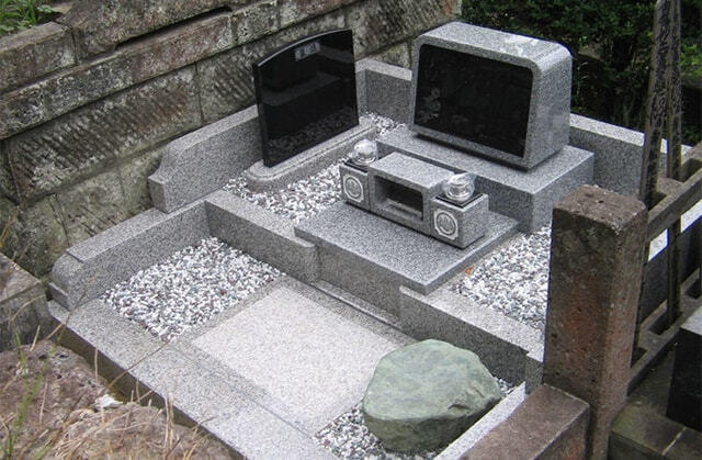 和型の石塔を「洋型石塔基本型」にし、傷んだ周囲の囲いをフロア型の外柵にリフォームしました。全体をグレーにまとめ、墓石正面など一部に黒を使うことでアクセントになっています。
