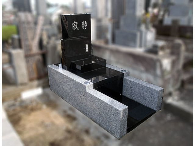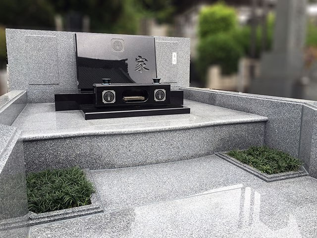 1級建築士さんのご家族の為のお墓。黒と白の石材を用いて、四角い石の組み合わせが印象的なデザイン墓石です。石材の重量に耐える強度の基礎工事、施工方法もいつも以上に検討して挑みました。施工現場まで勾配が多い丘陵地だったので、運び込める石材のサイズも熟慮しました。